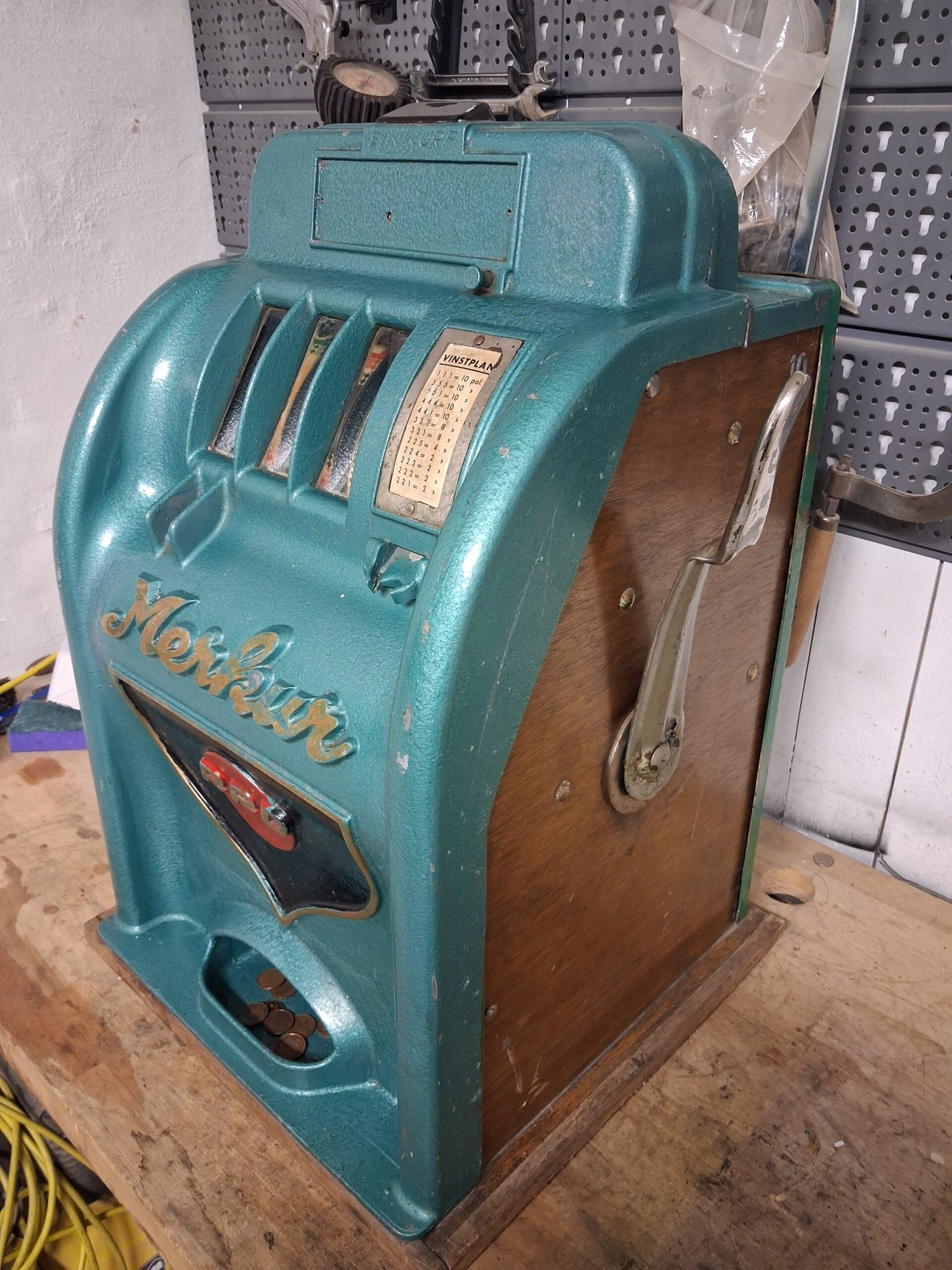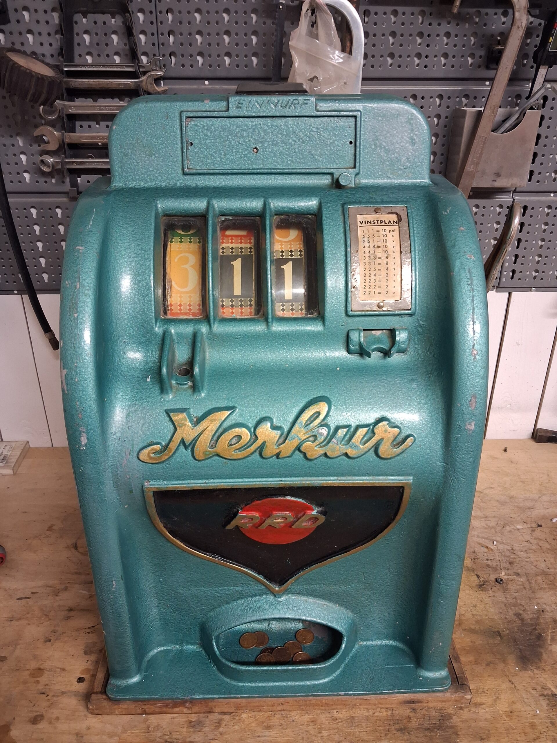 Smuk og velholdt enarmet tyveknægt fra 1950’erne af modellen RRD Merkur. Automaten er fuldt mekanisk og kræver derfor ingen strøm for at fungere, hvilket gør den både driftssikker og autentisk i sit udtryk.